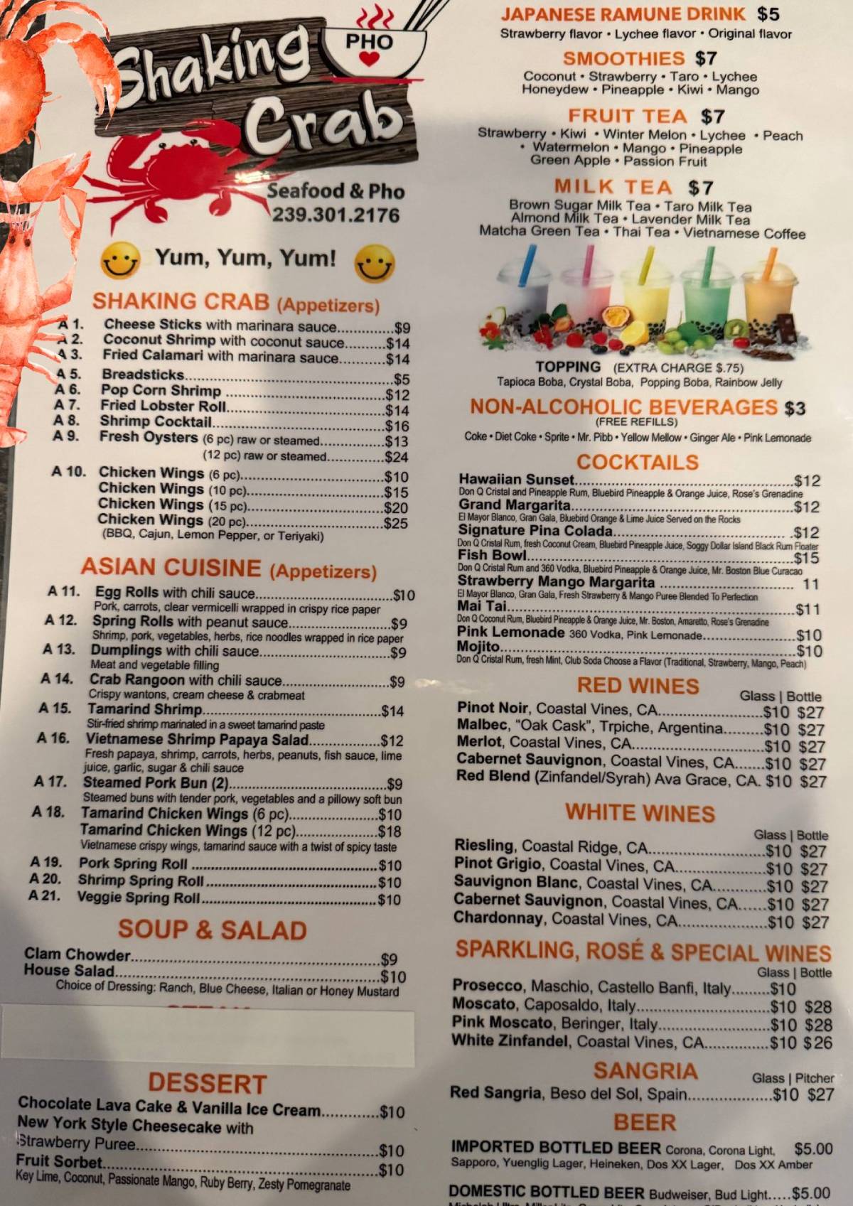 Fresh seafood tossed in bold Cajun-style sauces and authentic Vietnamese pho served hot and Shaking Crab. Clean, cozy atmosphere, friendly service, and fair prices — a perfect spot for seafood lovers and family dining.